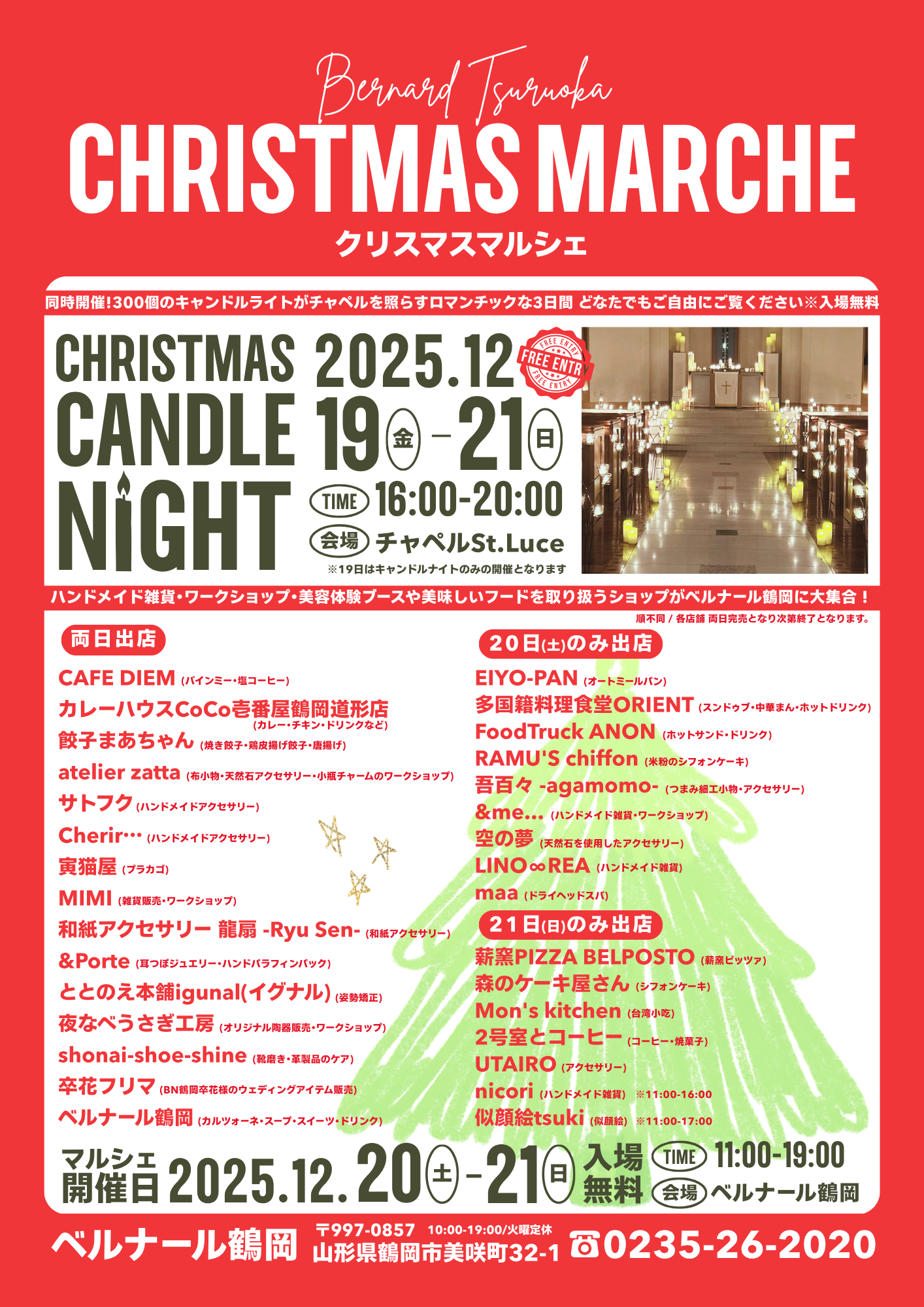 【山形イベント情報12/19-21】キャンドルナイト&Xmasマルシェ(鶴岡市)