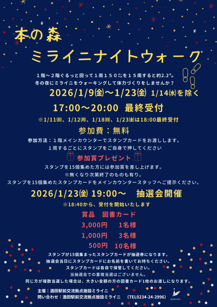 【庄内イベント情報1/9-1/23】本の森ミライニナイトウォーク・抽選会(酒田市)
