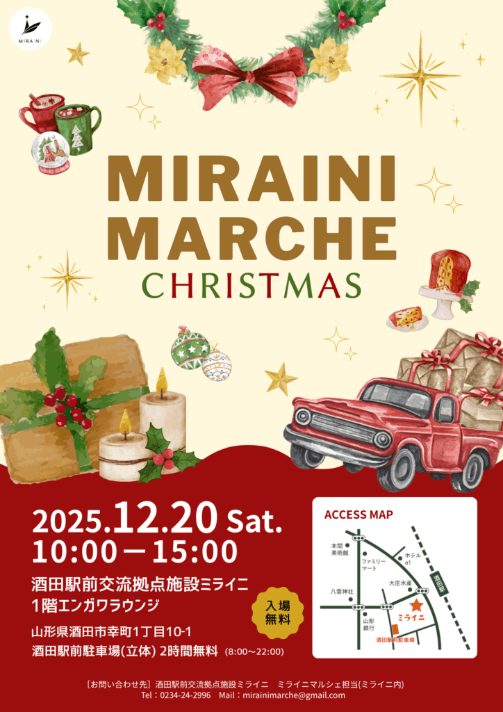 2025年12月20日(土)に、酒田駅前交流拠点施設ミライニで「ミライニマルシェ クリスマス」が開催されます。