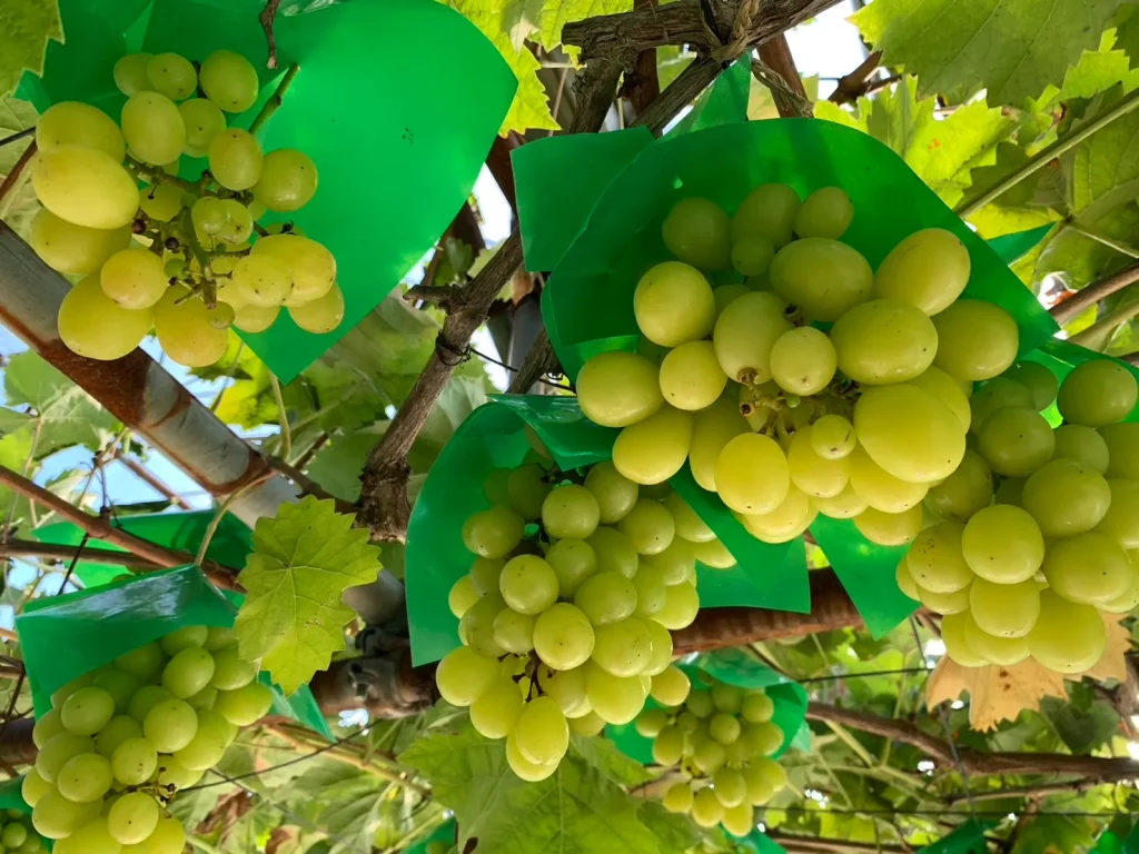 今年は例年より実りがよく、たくさんのシャインマスカットが完熟を迎えています。